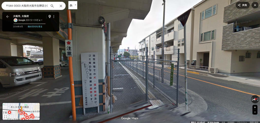 大阪市の様々な区の一丁目1番地の写真が撮影されてあって、うちの会社の住所は小路東2丁目20番25号なんだけど、その「小路東一丁目1番地」の写真が右上。殺風景な、あそこだなっ。とおもった。長屋の街並をガバッと潰して、内環状線の道路の一部が開通したのが1970年代。いつかのブログにその内環状線のコトを書いたが、その殺風景な一角が、小路東一丁目1番地になった。↓ いま、グーグルのストリートビューで見るとこんな感じ。