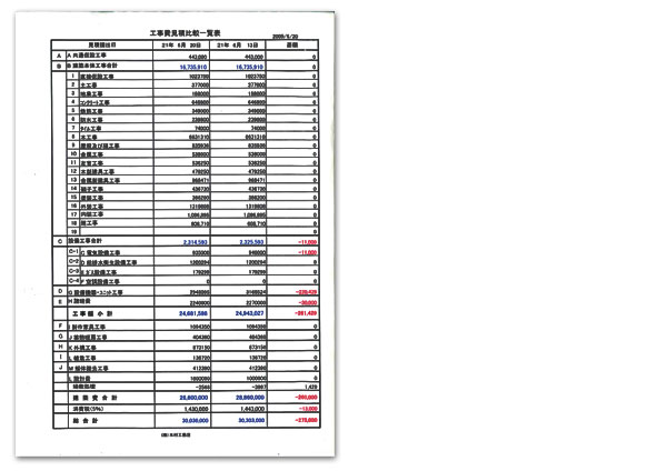 ○見積調整の比較見積内容が変わる度に比較表を提出。お施主さんの価値観と金額を比べて調整