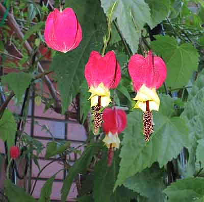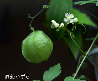 自然に生えた蔦です可愛い花は直径4ミリ位で実は紙風船そのものですね、 来年には種を頂こうと思っています。 |