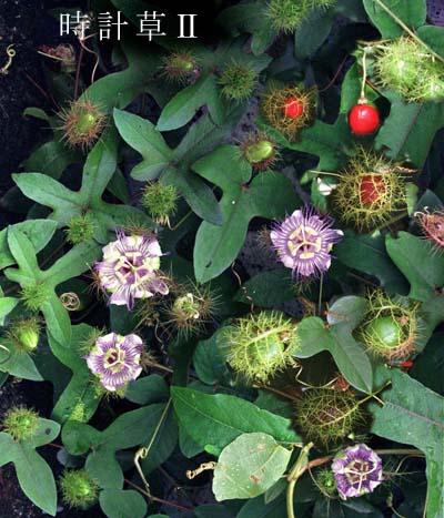 これも時計草の仲間です、青い実が徐々に赤くなって 種は完全に乾いてから採取しないとかびが生えます。 |
