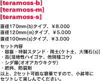 「コケボール」からコケボールセット「テラモス」へバージョンアップ!![]() [テラモス-ビー、170mm] [テラモス-エム、120mm][テラモス-エス、100mm] 以下のサンプル例は [テラモス-エム]直径120mmサイズです |
