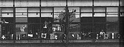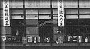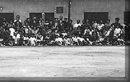 | ●当時の講堂前に大勢の観客、窓にはプログラムが 垂幕にしてあり、種目が終わると、ひとつずつ外 されていく。あと二種目あるのがわかる。 (昭和39年) |