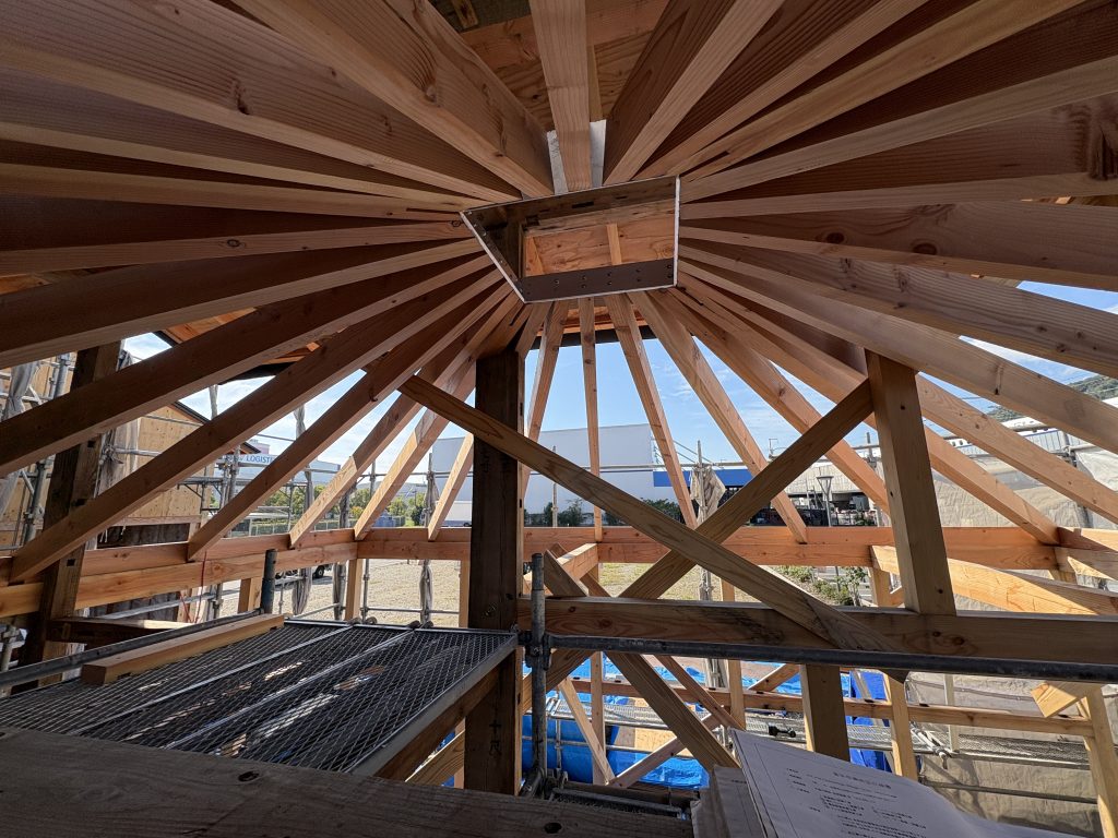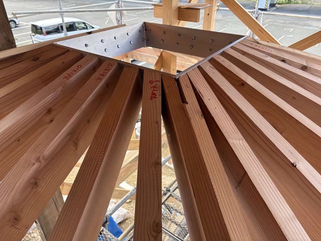 扇状に広がる垂木の接合部には金物を使っているので、ひとつひとつの精度がとても大事な工程です。
