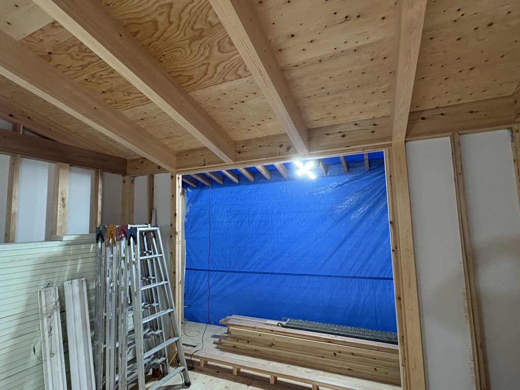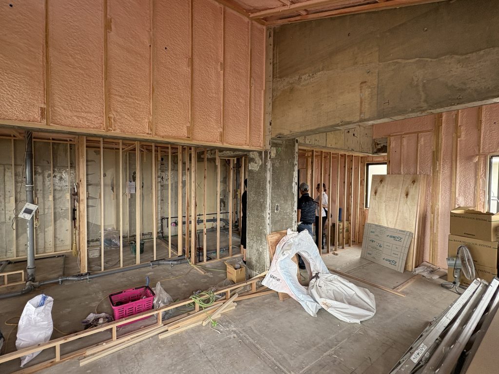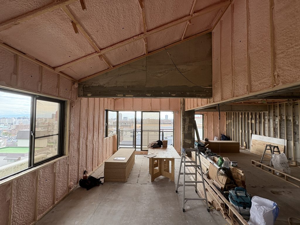さて、西宮市では渋いマンションの一室のリフォーム工事。最上階で断熱性を高める為、吹き付け断熱を施しました。吹き付け断熱は駆体にしっかり穴なくくらいつくので、こういったRCの建物には非常に効果的に感じます。最上階ならではの斜め天井を活かして、楽しい空間が出来上がっていきそうです。