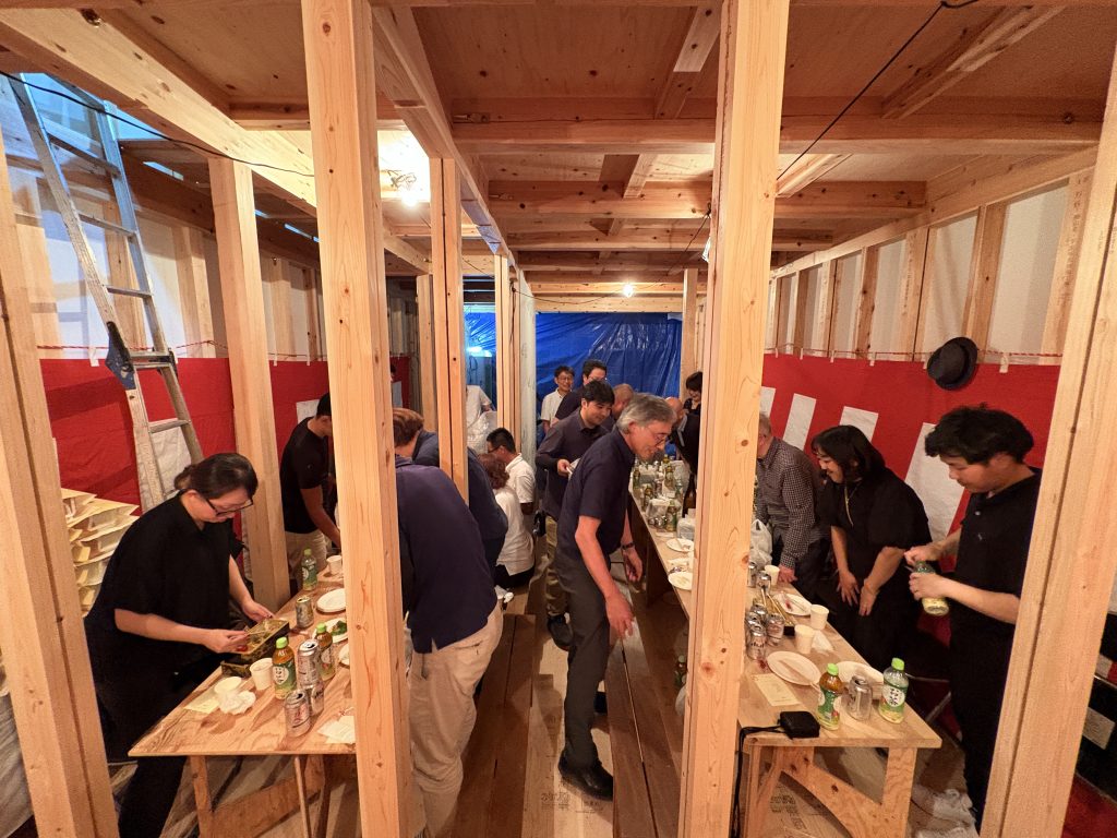 社員職人勢揃いの大直会。木組みの下で宴をするのはいつも独特の心地よさがあります。御年92歳の奥様の祖父から貴重な昔話を伺ったり、何よりH大工、こんな大人数をお招き頂きありがとうございました。
