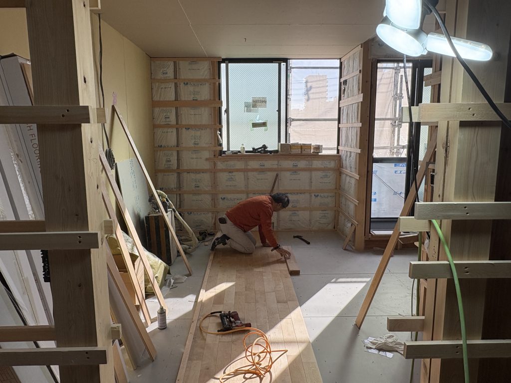 東成区・Kマンション新築工事ではフローリングを貼り進めています。