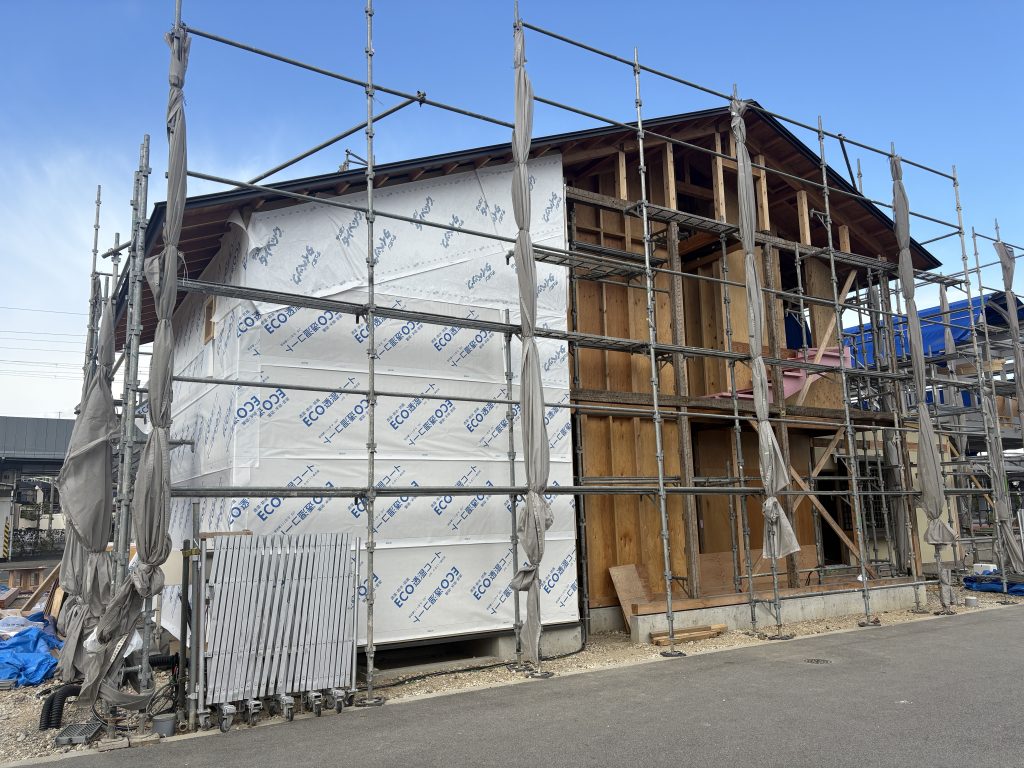 外部は透湿防水シートまで張り終えて、建物の輪郭がかなりはっきりしてきました