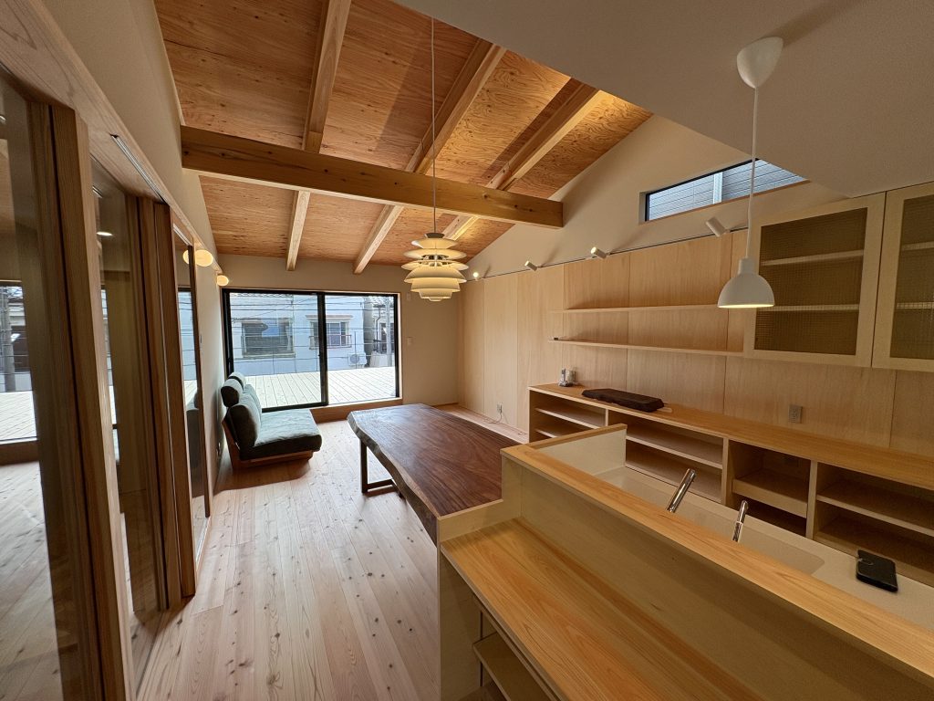 木でグルっと包まれたあたたかな室内と空中デッキが特徴です。