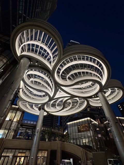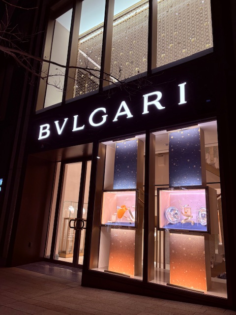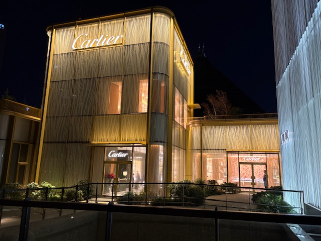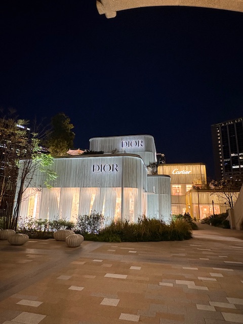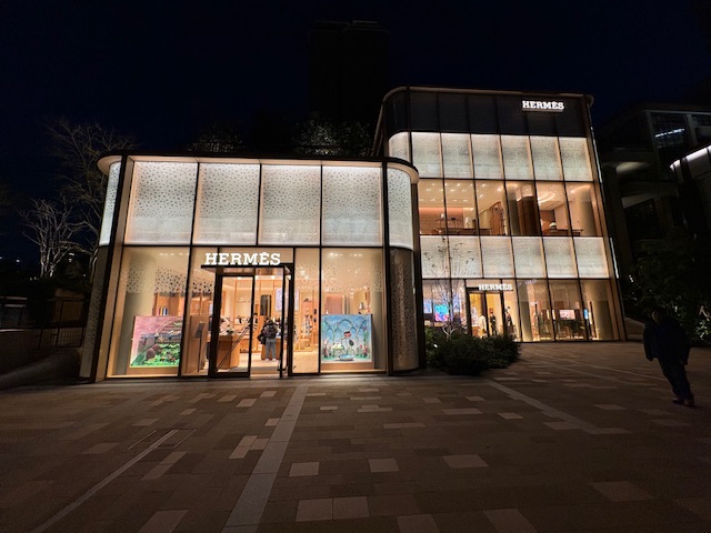そして最後は年末に麻布台ヒルズに再訪問した時に撮った「ガーデンプラザ」にあるエルメス、ディオール、セリーヌ、カルティエ、ブルガリ、ボッテガ、ヴェネタといった世界的なハイブランドの夜景写真です。