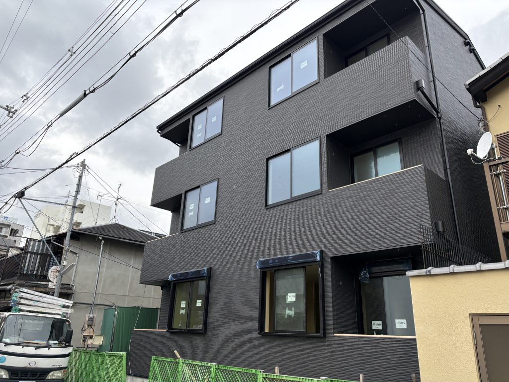 東成区・Kマンション新築工事は足場も取れて外観がお目見えです。