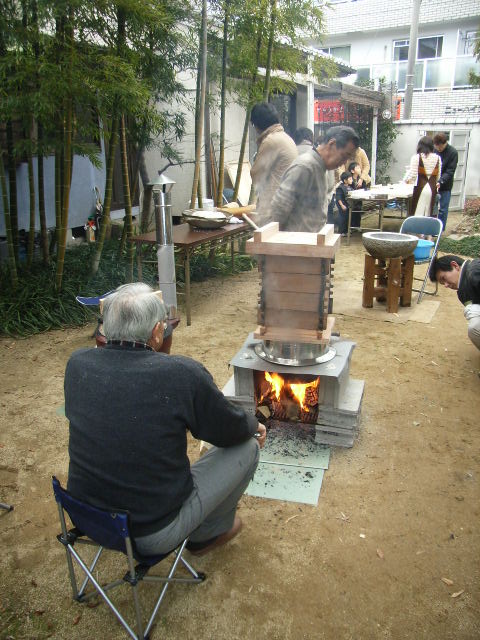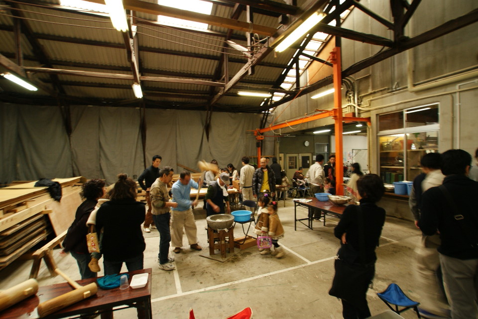 それで、この楽しさを継続しようと、2009年からは、天候のことを考慮して、この加工場で、催すことにした。日程をどうするかだった…..もともとは、年末にお餅つきをする習慣が、木村工務店と近隣の長屋の住人の間であったらしい。なので、存命中だった2代目木村正一が、12月29日は「苦を突く」といって避けていたから、やるのなら、27日か28日か30日やなっ!と言われた…..。工務店にとっての年末の現場を納める苦労のコトを考慮すると、とっても年末に出来る余裕などなく、それで1月に開催するコトになった。