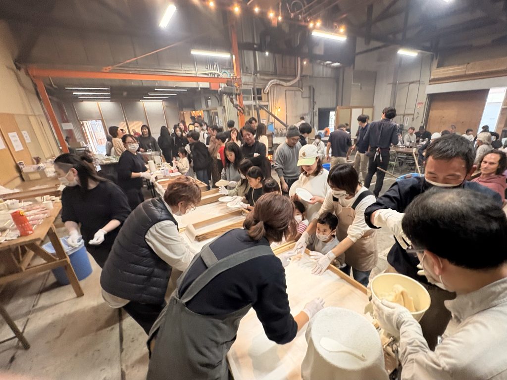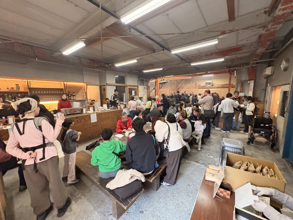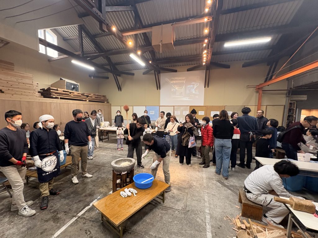 「まちのえんがわ」のオープンは、2011年12月で、まだワークショップも開催していない時代だったので、加工場を使う初めてのイベントだった。やるのなら、社員とその家族だけでなく、いま施工中と打ち合わせ中の、お子さんのいらっしゃる、少数の方々だけを招待してみよう!ということになり、40人ほどの参加者と一緒にお餅つきを開催した。それが2009年のコトで、それからコロナ禍で中止の3年ほどを除いて、連続開催している。