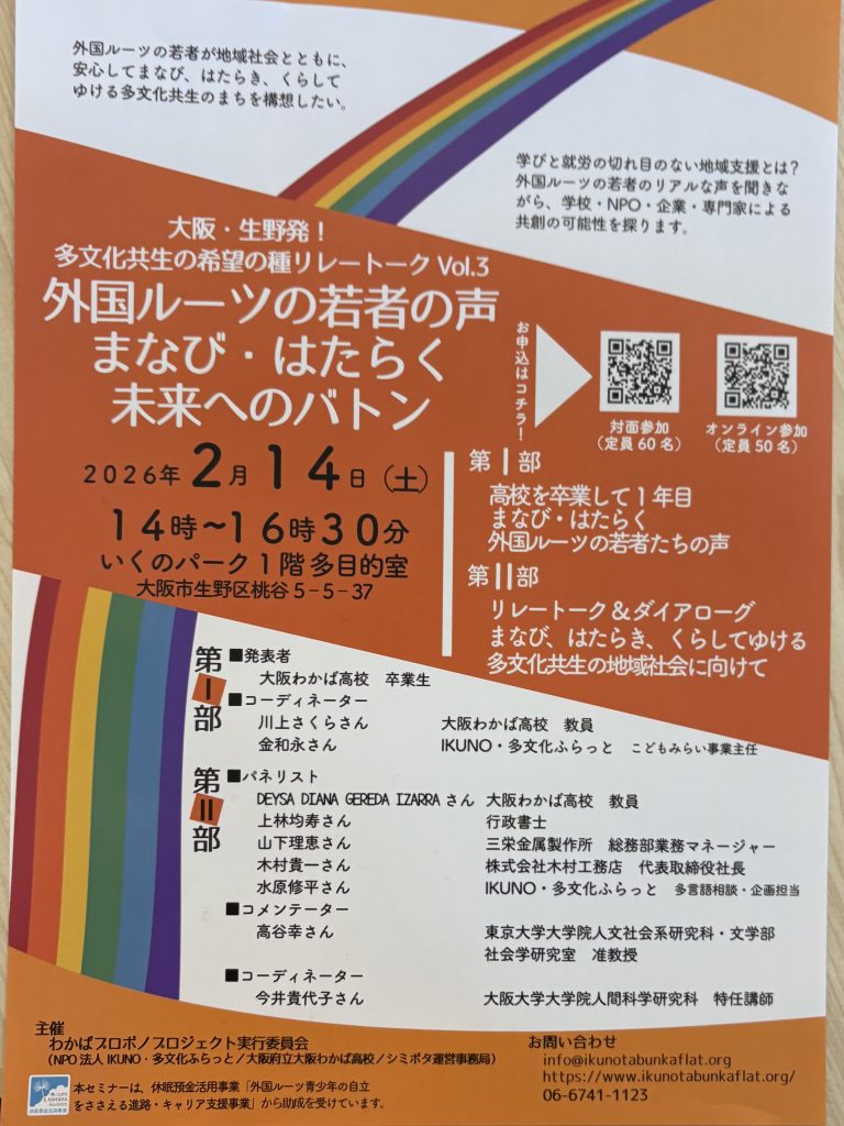生野区の御幸森小学校が廃校になり「いくのパーク」とよばれる施設になって、その中に「多文化フラット」というNPO法人の事務所があって、そこの内装工事を施工した関係性があり、お声がけを頂いた。ちょっと場違いな立ち位置の、私と木村工務店なのですが、それでも生野区で木村工務店は90年間生息し、まちづくりというか、まちとの関係性を、工務店という立ち位置から、ものづくりの町として紐解き、トークを求められたようにおもう。生野区の人口減少にともなう学校の統廃合によって、大阪わかば高校という外国人移住者に日本語を教える学校があり、多文化フラットとの密接な関係性があって、こんなリレートークになっている。