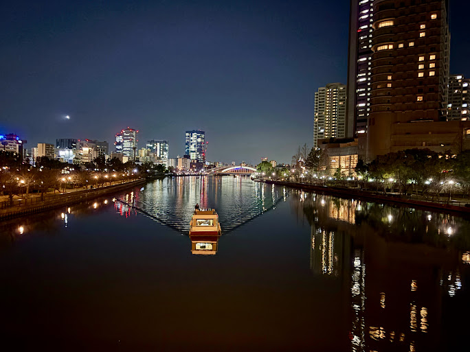 会合の帰り、ホテルを出て、橋の上を歩いて、右手の大川を振り向いて、見下ろしたら、こんな景色だった。顔に冬の夜の冷たい空気を感じて、川にゆらめく光が、ちょっと物悲しい感じがして、その川面を割っていくように静かに進んでいく船に、何かの気分を感じたんだろう…..ポケットからiphoneを慌てて取りだして、ちょっと立ち止まって撮影した。