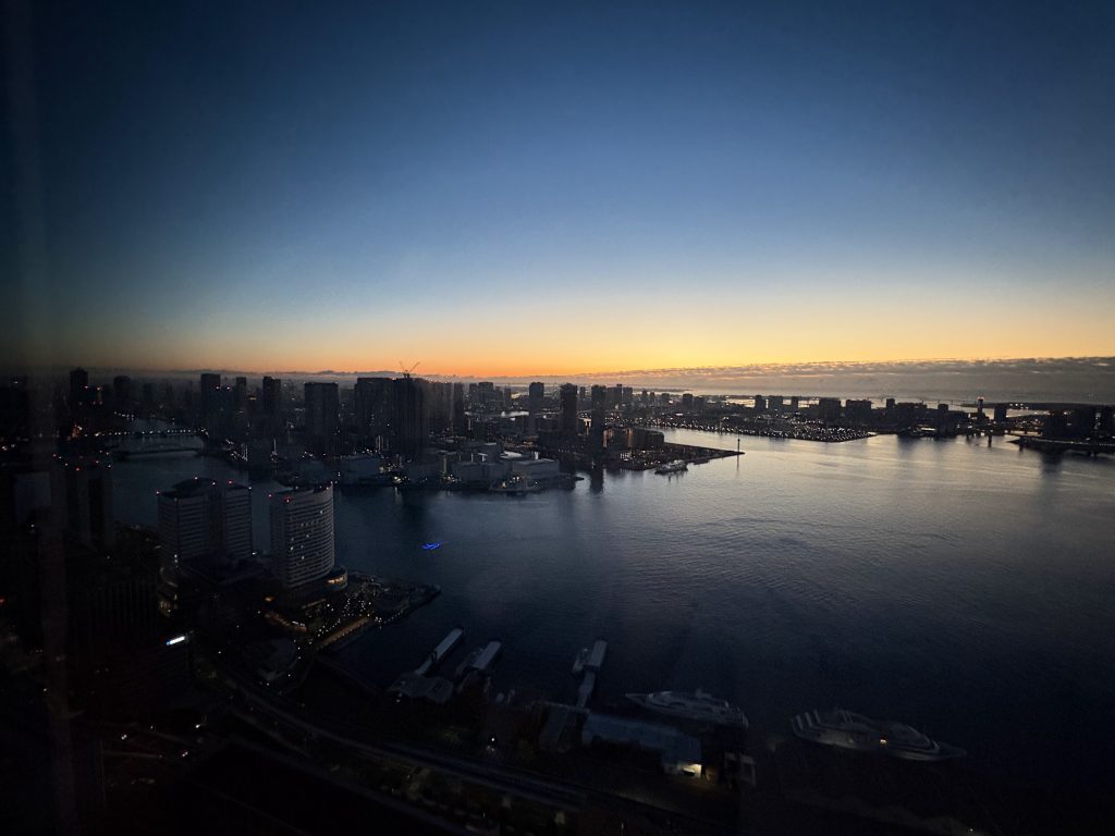 この「芝浦ビル」のホテルに泊まって、こんな景色を眺めた。「訪れる人々がこの場所にきたら、一生忘れることのできない、新しい祝祭性の実現を目指す」というコトバどおりの、リアリティを、心底実感し、なにより私たち夫婦にとっての「心象風景」をかたちづくってくれた。そんな「芝浦ビル」での二日間だった。