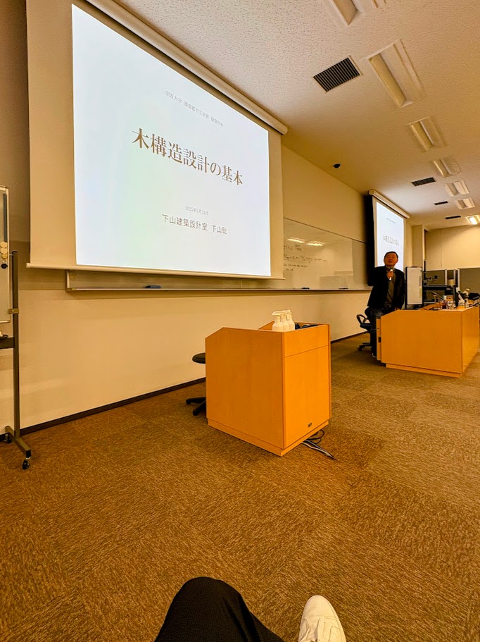 授業は意匠担当の米谷さんと構造担当の下山さんと工務店の私の3人チームで担当する。私の役目は「ものづくり」としての建築を伝えるコトで、うちの会社でもそうだが、設計をやっていると、建築が、ものづくりとして、大工さんや職人さんの人の手作業によって造られていくことを忘れがちになってしまう。特に木造は手作業に頼る部分が多い。森林から取れた4mや6mの長さの木材を使ったリアリティーのあるオーソドックスな木造の設計と製図を学ぶ授業でもある…..。